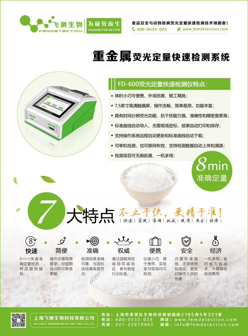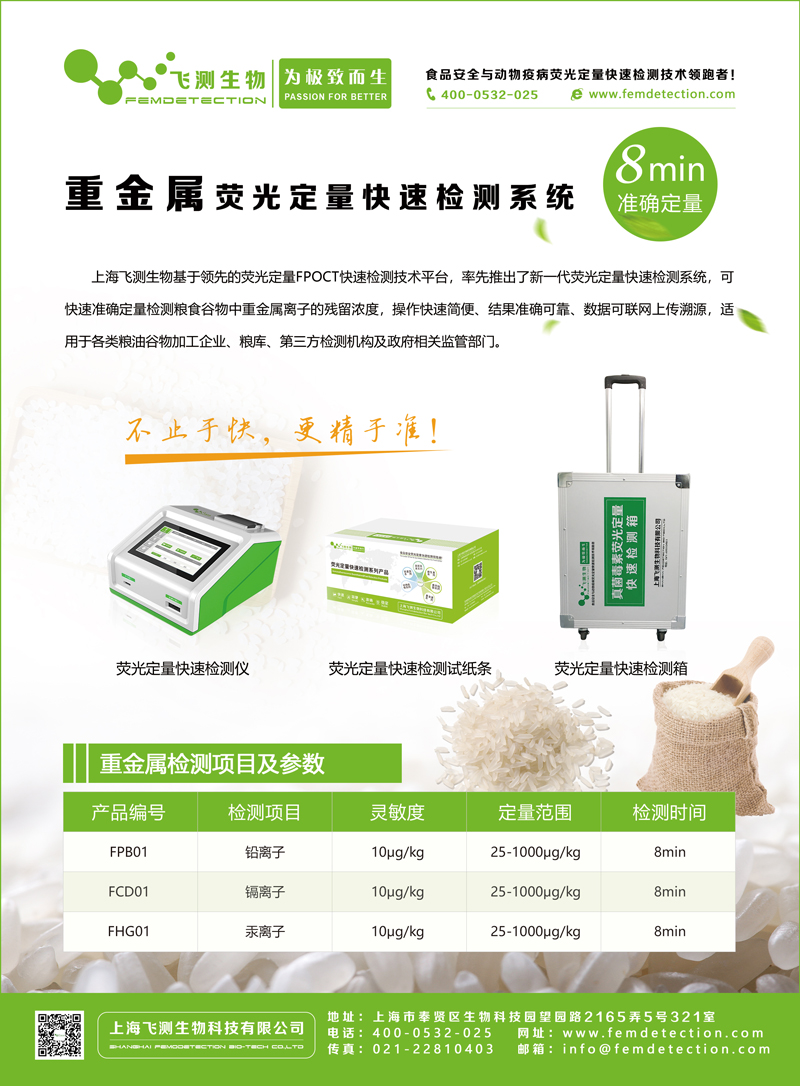 以上幾種方法所需儀器較復(fù)雜貴重,前處理準(zhǔn)備時間及檢測時間較長。南京微測生物基于領(lǐng)先的熒光定量FPOCT技術(shù)平臺,開發(fā)了真菌毒素+重金屬+農(nóng)藥殘留三合一熒光定量快速檢測系統(tǒng),該系統(tǒng)結(jié)合了膠體金快速、酶聯(lián)免疫定量以及色譜法準(zhǔn)確的特點,可在8min內(nèi)快速準(zhǔn)確定量的測定出食品中重金屬的含量。前處理時間40分鐘左右,檢測范圍25ppb-1000ppb,可以滿足限量標(biāo)準(zhǔn)檢測;操作簡便,只需一步加樣,無需標(biāo)準(zhǔn)品,無需做標(biāo)準(zhǔn)曲線,采用熒光免疫定量分析儀讀數(shù),結(jié)果準(zhǔn)確可靠且可現(xiàn)場打印,準(zhǔn)確性高度符合HPLC法的檢測結(jié)果,為重金屬的快速檢測提供了一種全新的技術(shù)手段,適用于各類飼料加工企業(yè)、第三方檢測機(jī)構(gòu)及政府相關(guān)監(jiān)管部門。