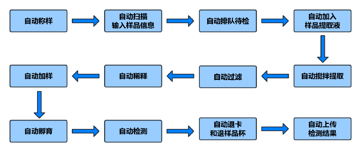實(shí)現(xiàn)樣本從稱量、加液、振蕩提取、分離、稀釋混勻、孵育到檢測(cè)的全流程自動(dòng)化與無人化;